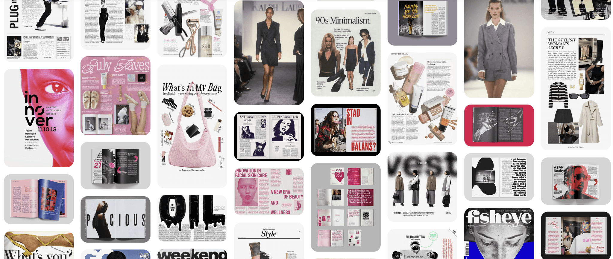 Pinterest was my best friend during the research phase. It helped me gather leads, explore different visual directions, and narrow down exactly what I wanted the magazine to feel like. From layout styles to typography and imagery, it was essential in shaping the aesthetic foundation of the project.